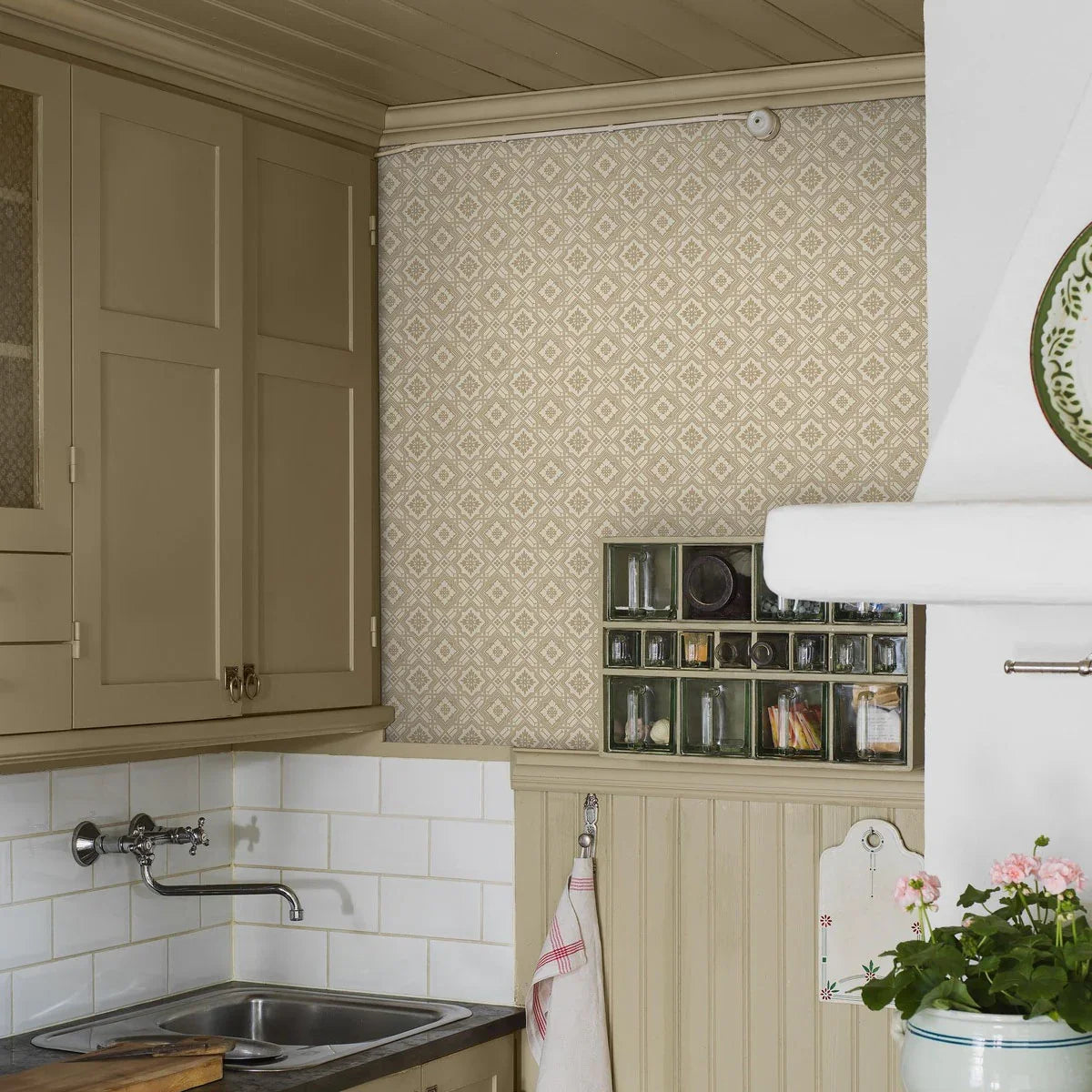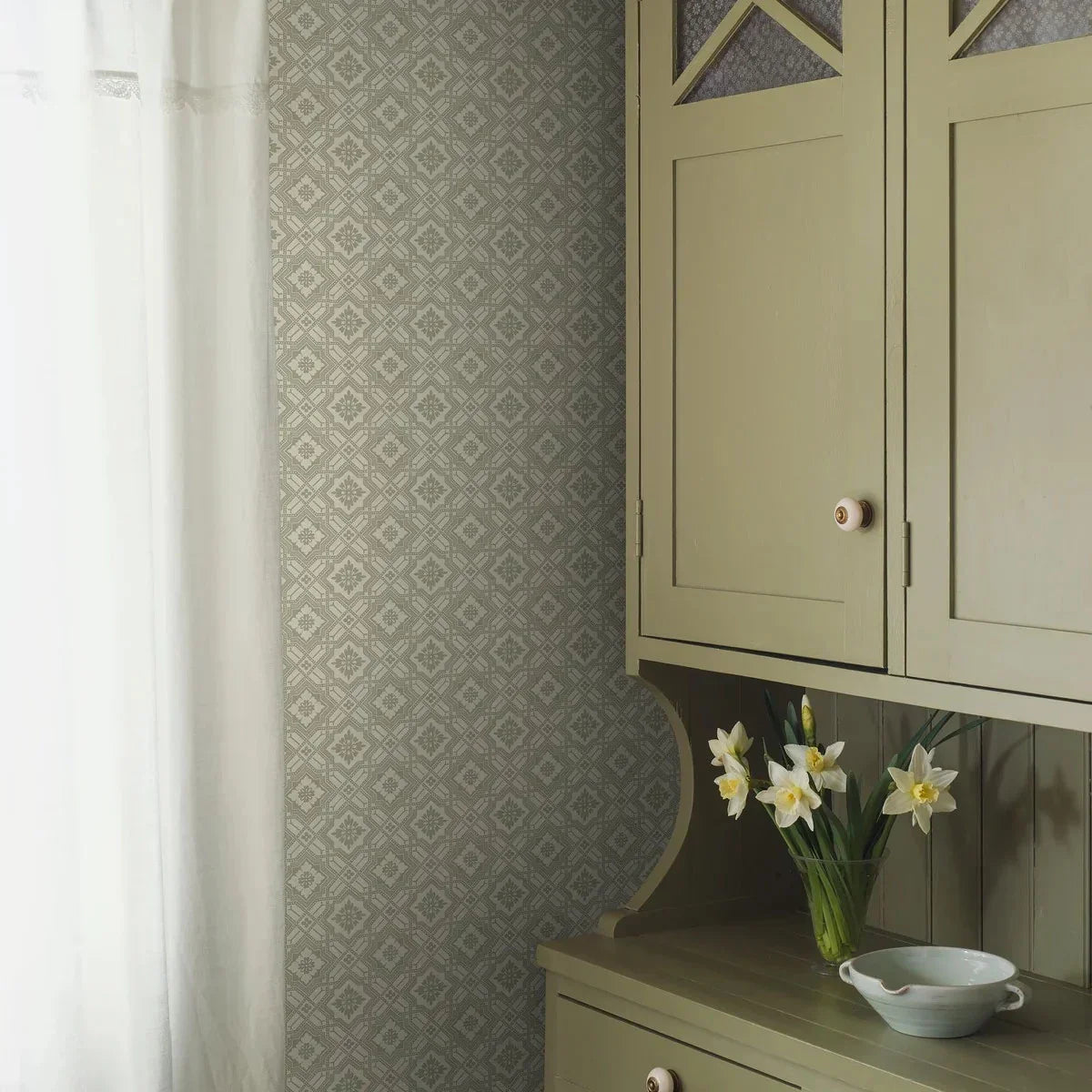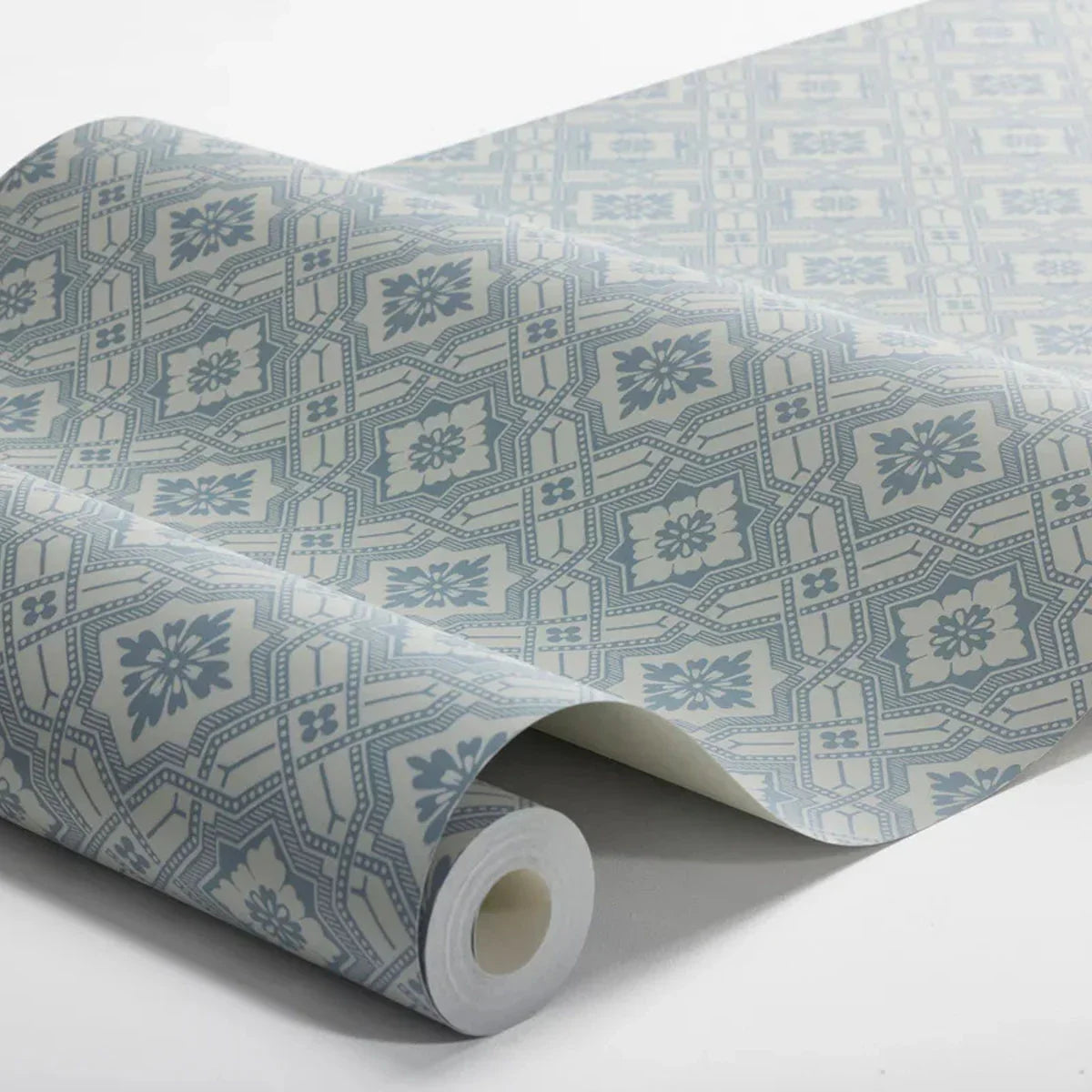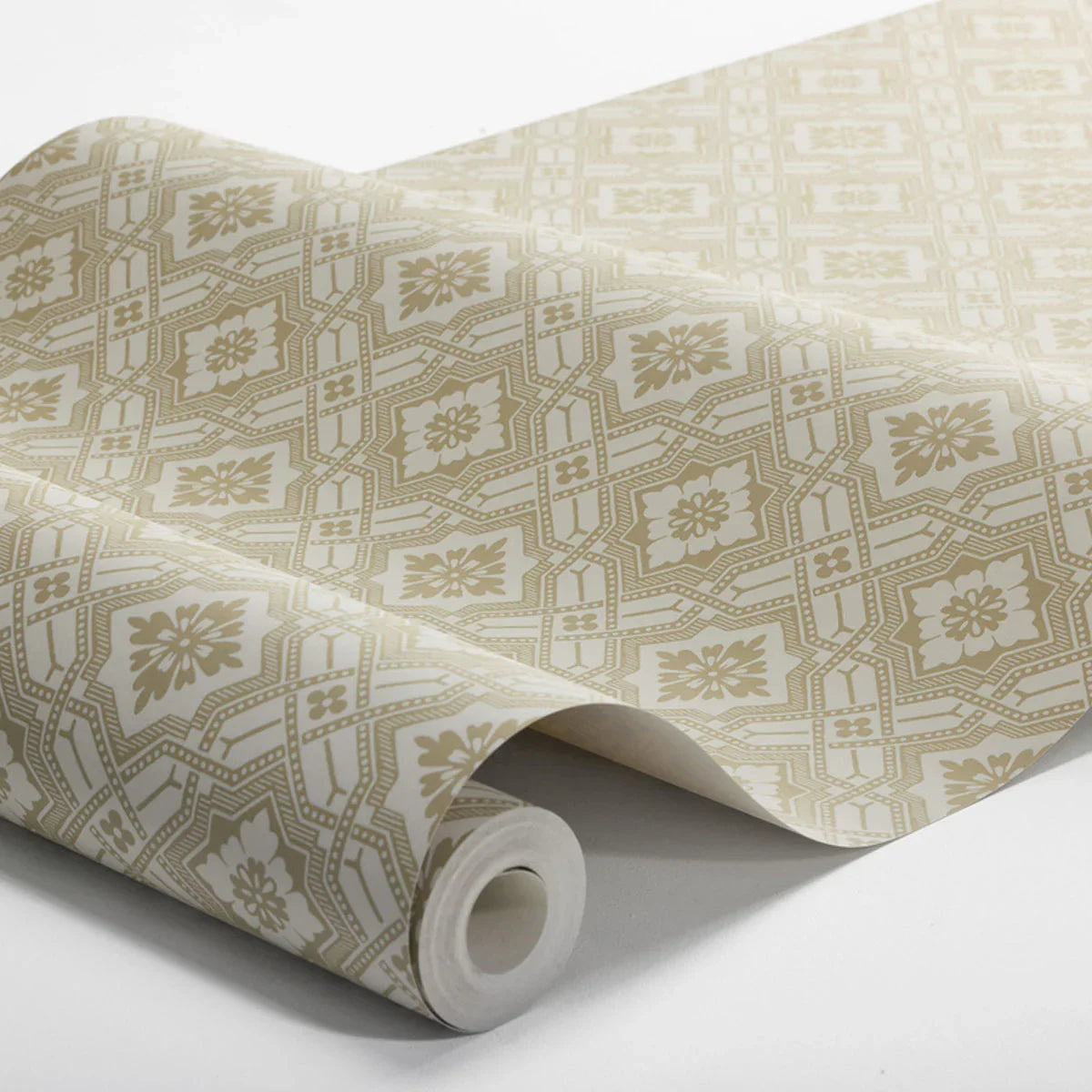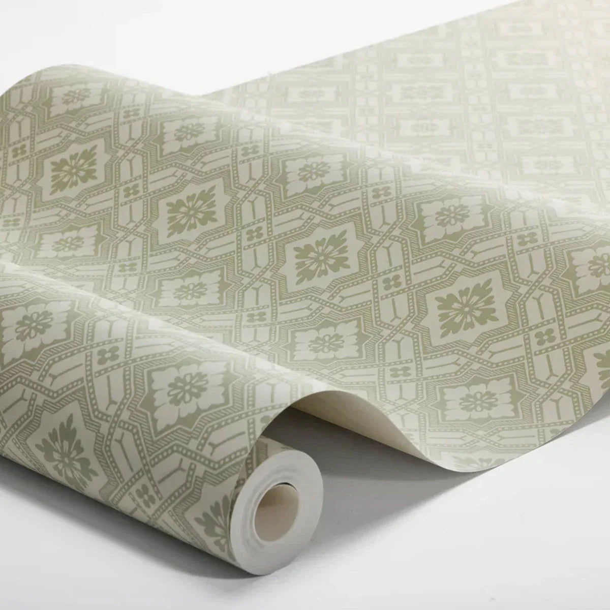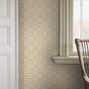 Inspired by an early 20th-century original, our Friedrich wallpaper features a refined geometric pattern of diamonds, subtly enhanced with floral motifs, lines, and dots. From a distance, it appears as a textured, tonal surface—step closer and its intricate detail is revealed.