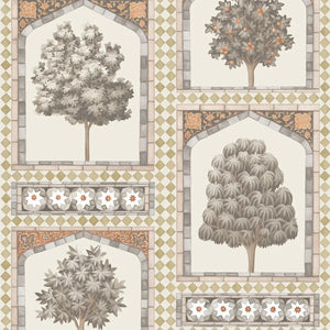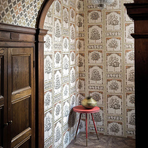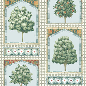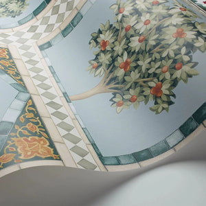 Sultan's Palace brings together two of Martyn's most influential design elements: traditional British motifs and Eastern-inspired artistry. A cartouche of English trees is the focal point of this stunning patchwork surrounded by faience tile mosaics, inspired by the facade of the Wazir Khan Mosque in Lahore, with its highly decorative archways and intricate botanical tiles. This rich design comes in regal tones of China Blue and Ochre, Print Room Blue and Duck Egg, and Gold and Spice, and can be paired with Zellige and Zellige Border.