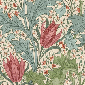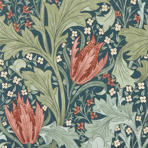 Originally sketched and coloured for wallpaper, Lent Lily has been thoughtfully refined by the Morris & Co. design team. Bold, stylised floral motifs of pointed tulips contrast with the swirls of the iconic acanthus leaf. The name Lent Lily refers to the miniature wild daffodils nestled into the ground of this lovingly adapted design. Taken from a rarely seen watercolour artwork in the archive, the design retains the original hand-drawn movement through a considered approach to the printing process. Available as fabric and wallpaper.