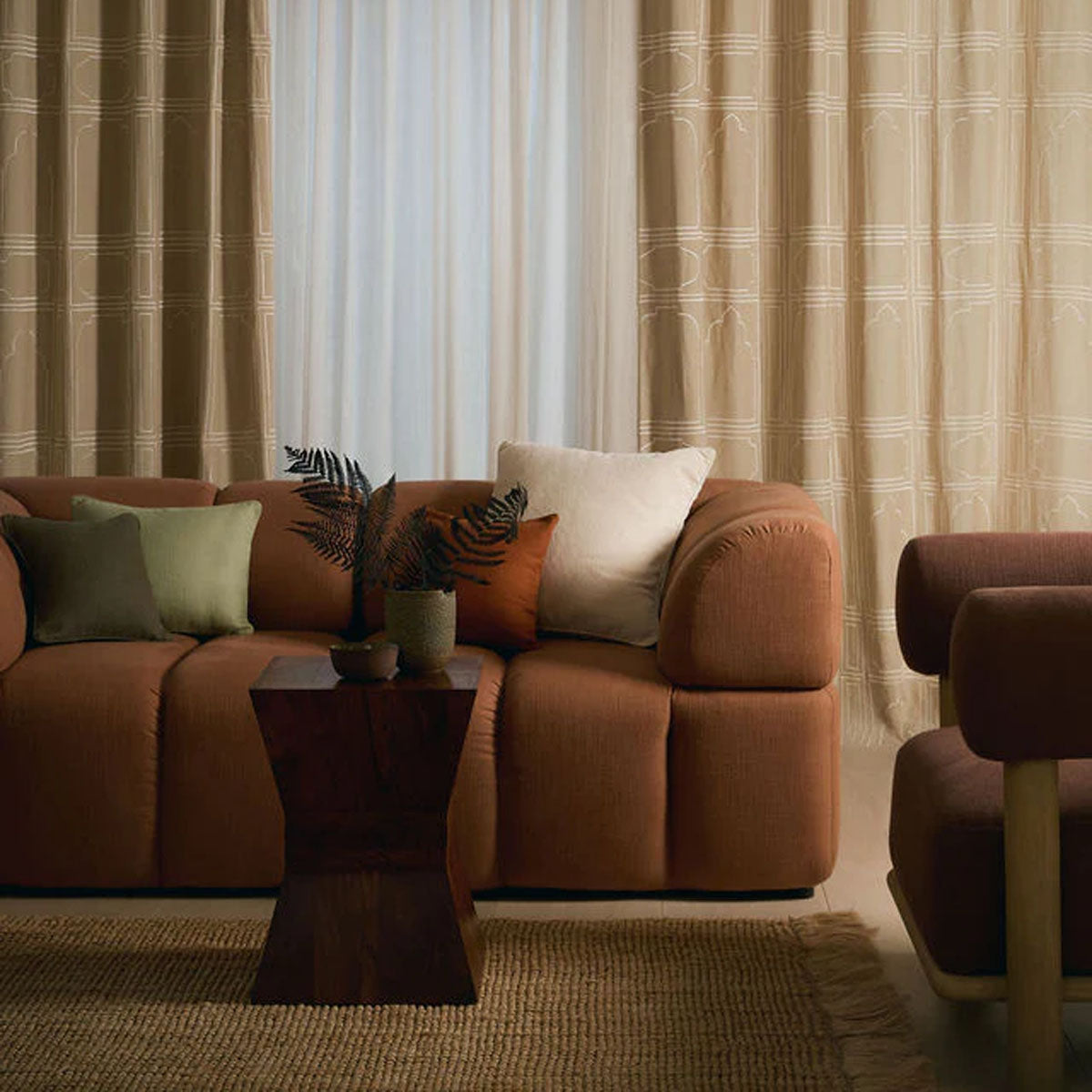 City Palace is modelled on the striking relief of the eponymous pink palace, one of the most renowned buildings of Jaipur. A timeless pattern embroidered against a durable linen-blend fabric, it’s an understated, minimalist way to experiment with print in any space.