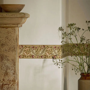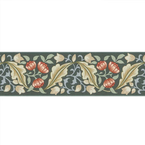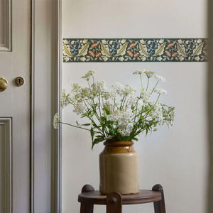 Celebrating the beauty of the original document, which had a typical Morris visual narrative, this horizontal border wallpaper of swirling acanthus leaves, peonies and bluebells brings a return of borders to the Morris & Co. portfolio. Discover Bluebell & Peony reimagined as an embroidered jacquard in the fabric book.