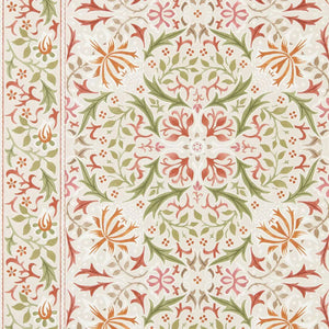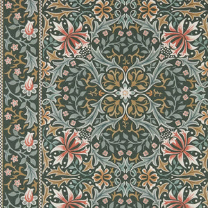 Walthamstow, an area of great significance to William Morris, is an adaptation of an artwork for carpet, held at The Huntington. Its vertical border, sketched initially in graphite, contains stylised honeysuckles, which the design team have incorporated in this beautifully translated pattern, with mirroring indicative of the typical 19th-century style. Honeysuckles, daisies, and acanthus leaves all swirl together in a striking repeat, edged by a checkboard border.