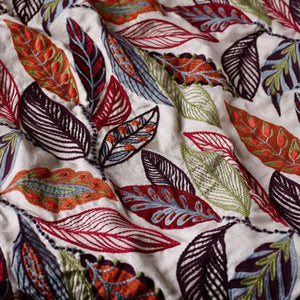 Large scale heavy embroidery, with its artistic rendition of fantasy leaves lying on a forest floor, has been painstakingly hand knotted to great effect giving an almost three dimensional appearance.