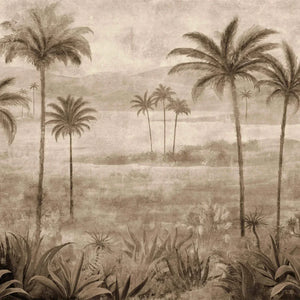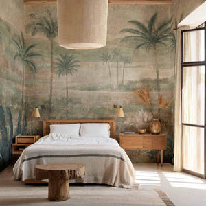 Draa Palms features a botanical design of slender palm trees swaying under the intense sun of Marrakech. Perfect for adding depth and character to any interior.
