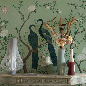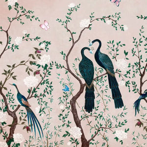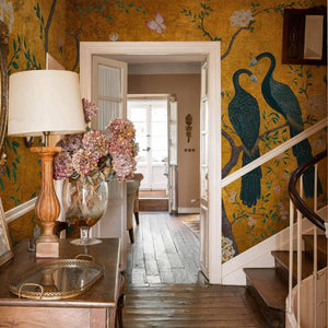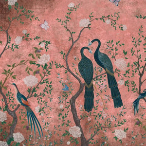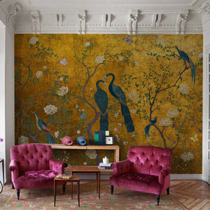 Edo, a gorgeous wallpaper mural by Coordonne, features elegant peacocks nestled among tree blossoms, perfect for adding visual interest to your home.
