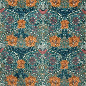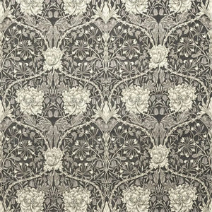 First produced in 1876 Honeysuckle & Tulip is an early Morris fabric design depicting entwined foliage and flower motifs in a mirrored pattern repeat. The effect is of a trellis circling large multi-petalled tulips and stylised honeysuckle.