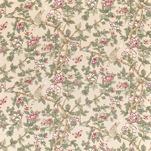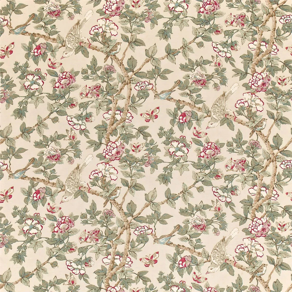Caverley is based on an early 19th-century hand block print depicting birds perched on a leafy bough with full blossoms. Although the principal bird has a distinctly exotic appearance, the design is typically English in style. The original print effect created by the blocks has been retained to achieve a rich textural fabric suitable for curtains and upholstery.
